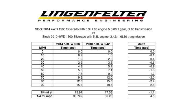 Here are some acceleration testing results compared to a stock 2010 Silverado 5.3L 4WD truck (with a 3.42 axle and the 6L80 transmission).