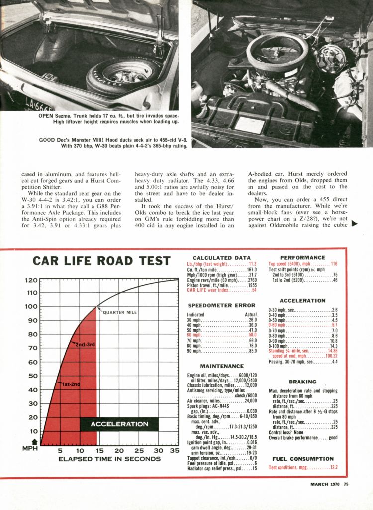 Now let’s compare it to an olden days car from 1970 – an Olds W-30 442. It was rated at 370hp, but a similar “W-34” engine in the Toronado was rated at 400hp, so we’ll go with the higher ‘gross’ number and use our .77 multiplier and give it 308 ‘net’ HP. It has a 4195lb test weight in CAR LIFE for a 13.62lbs/hp – basically matching the Camry.